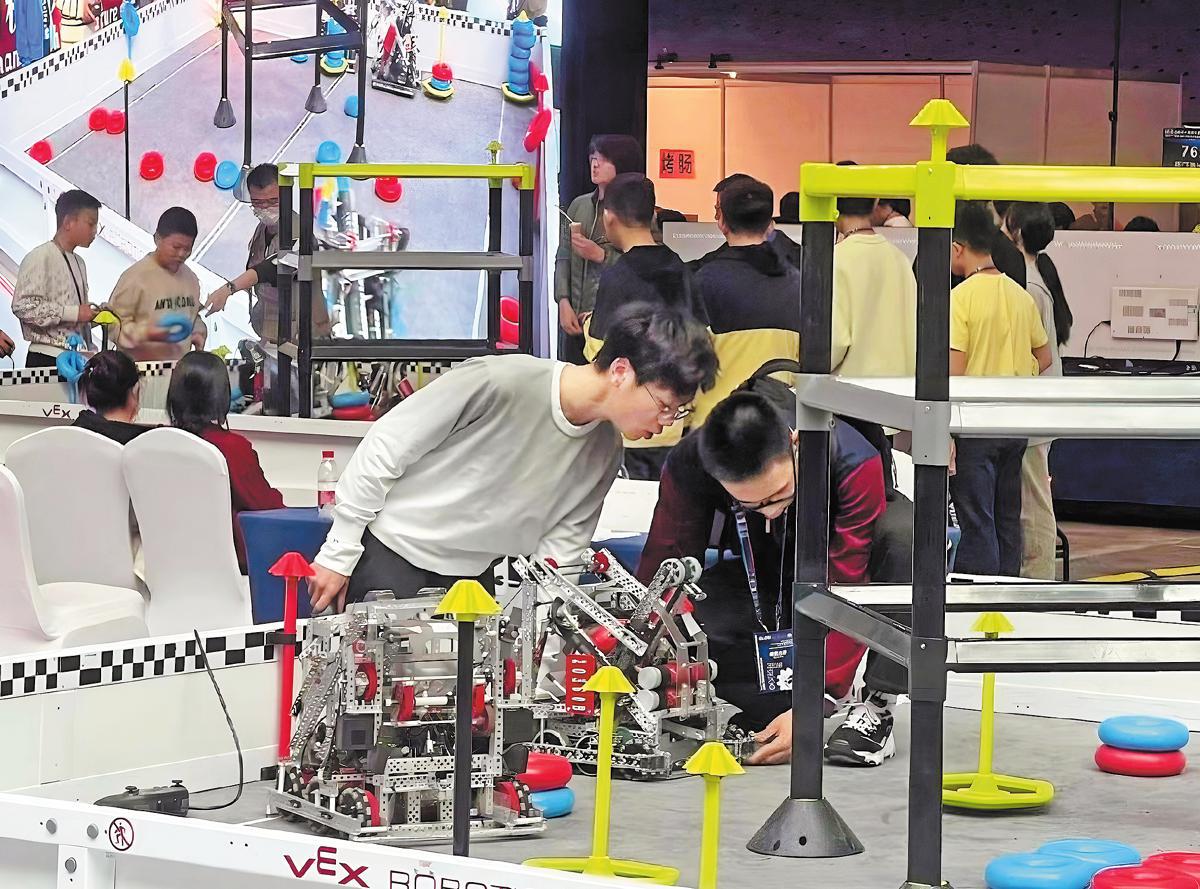 Студенти от младежката програма на университета Xi’an Jiaotong участват в състезанието по роботика VEX V5 в Xi’an, провинция Shaanxi, през януари 2025 г. [Photo provided to China Daily]