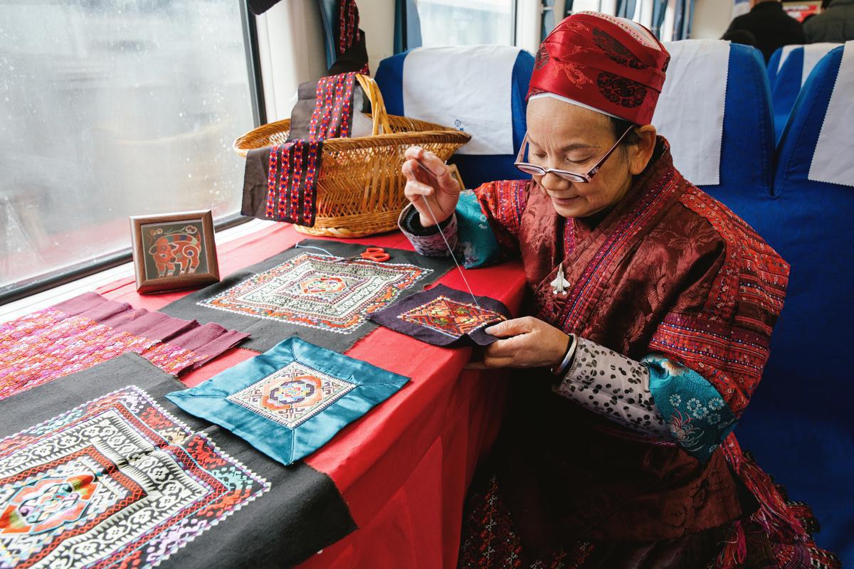 Възрастен занаятчия демонстрира етническа бродерия във влак № 5640. [Photo by Liu Boqian/for chinadaily.com.cn]
