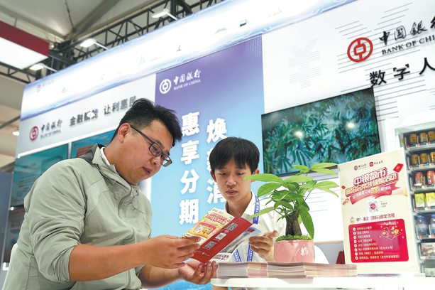 Посетител на Международния икономически и търговски панаир в Китай през 2025 г. пита за финансовите продукти на щанда на BOC. [Photo provided to China Daily]