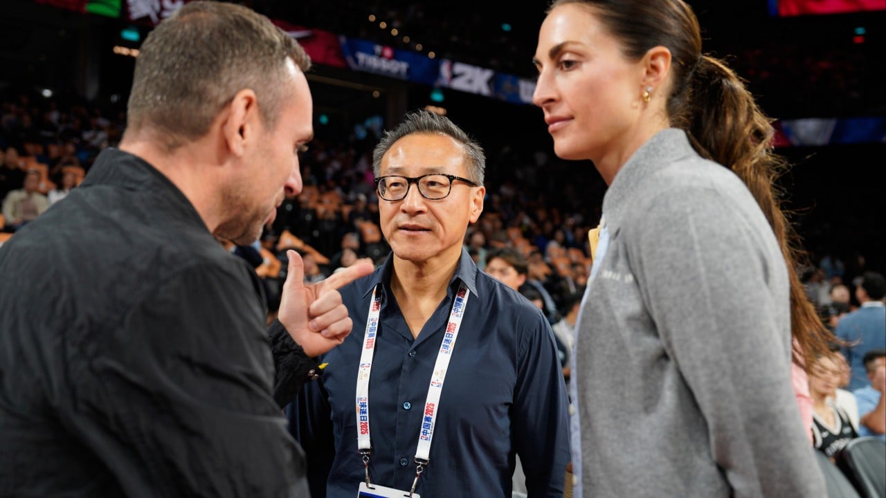 Цай, който е собственик на баскетболния отбор на Бруклин Нетс, говори в кулоарите на предсезонната игра в НБА.