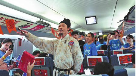 Високоскоростен влак, специално нает за баскетболни фенове, пристигна в Taizhou от Hangzhou в провинция Zhejiang миналия месец, част от съвместна инициатива на железопътните и туристическите власти за стимулиране на регионалната икономическа дейност чрез спорт.