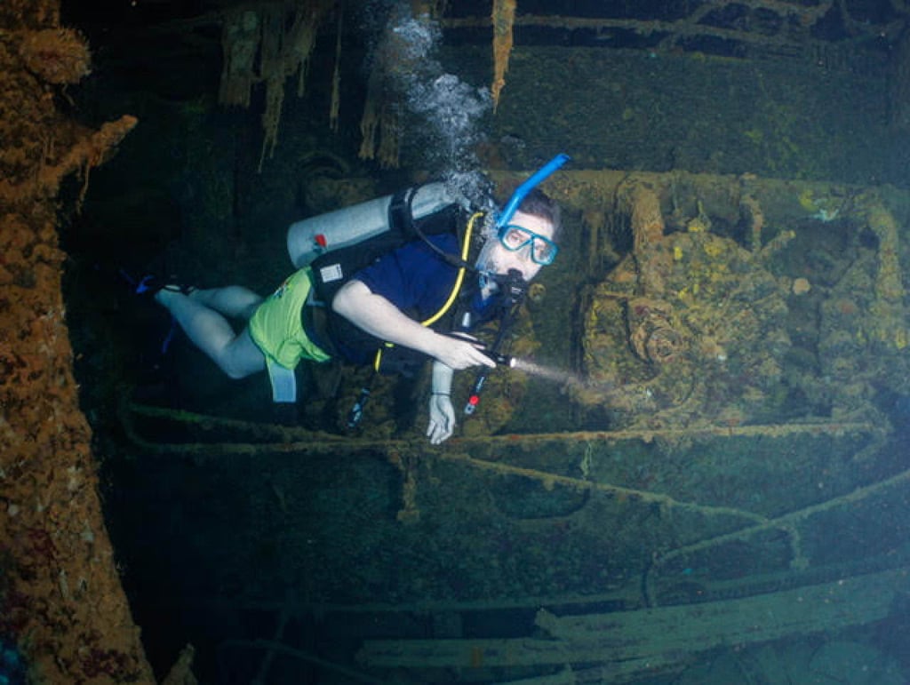Писателят се гмурка в близост до останките на Кийозуми Мару, друг японски кораб на императорския флот, в лагуната на Чук през февруари. Снимка: Джулиан РайълПисателят се гмурка в близост до останките на Кийозуми Мару, друг японски кораб на императорския флот, в лагуната на Чук през февруари. Снимка: Джулиан Райъл