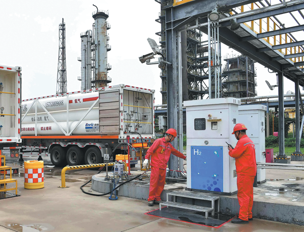 Персонал от Sinopec Zhongyuan Oilfield Company изпомпва водород в превозно средство в цех за производство на водород в Пуянг, провинция Хенан, на 12 август 2024 г. TONG JIANG/ЗА КИТАЙ ДАЙЛИ
